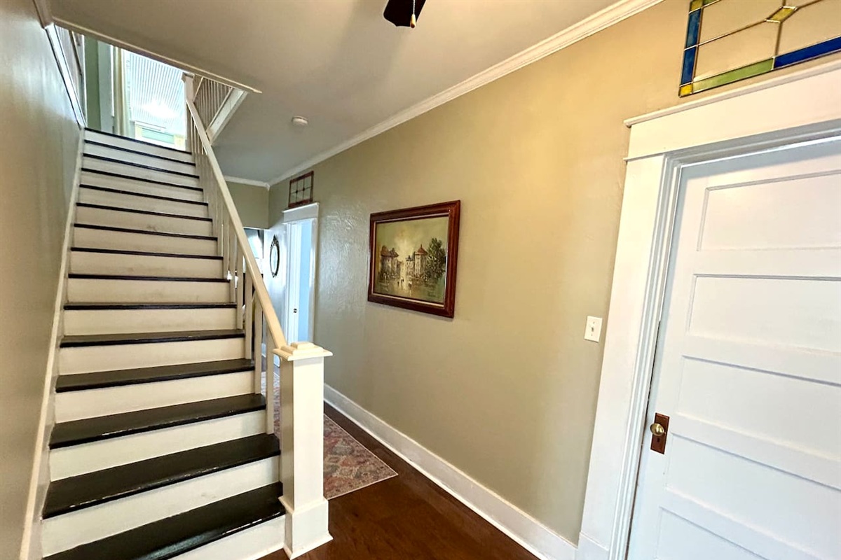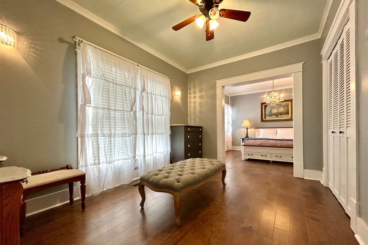 Once a pecan farm homestead, this property sits on a hilltop lot spanning over 3/4 of an acre. With three bedrooms and two baths, the home comfortably accommodates families, game-day guests or traveling professionals. Inside you'll find warm character throughout - from tall ceilings and elegant crown molding on the main level to classic beadboard ceilings and walls upstairs. The spacious primary suite includes its own sitting / dressing area and its own private porch, perfect for morning coffee or evening reading.
