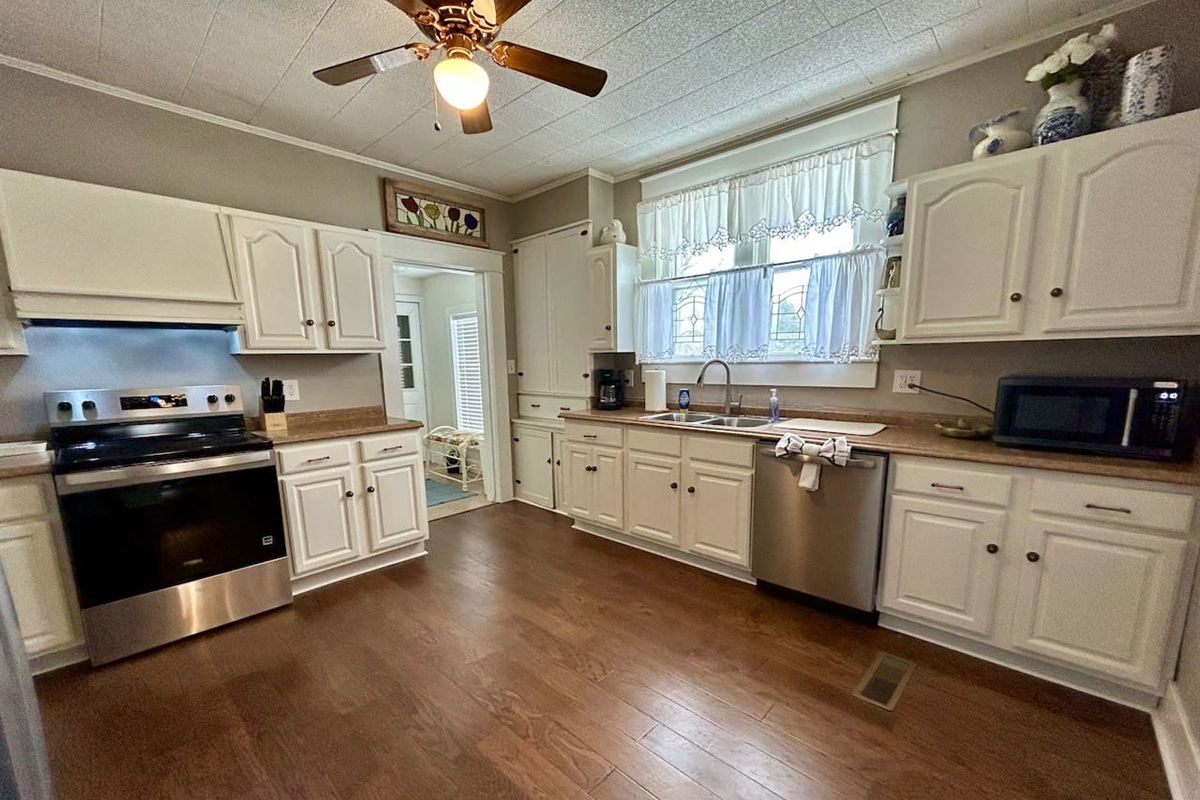 - Kitchen with ample cooking space, electric range, microwave, dishwasher,